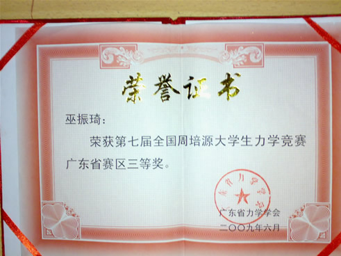第七届全国周培源大学生力学竞赛广东省赛区三等奖
