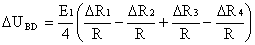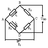 阻分别为R1、R2、R3和R4。在对角节点A、C上接电压为E1的直流电源后,另一对角节点B、D为电桥输出端,输出端电压为UBD,且